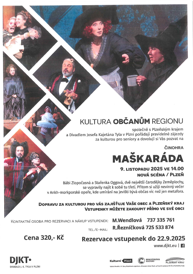 Kultura občanům regionu společně s Plzeňským krajem a Divadlem J.K.Tyla v Plzni pořádají pravidelné zájezdy za kulturou pro seniory a dovolují si Vás pozvat na činohru MAŠKARÁDA - 9. listopadu 2025 ve 14:00 hodin Nová scéna/Plzeň.