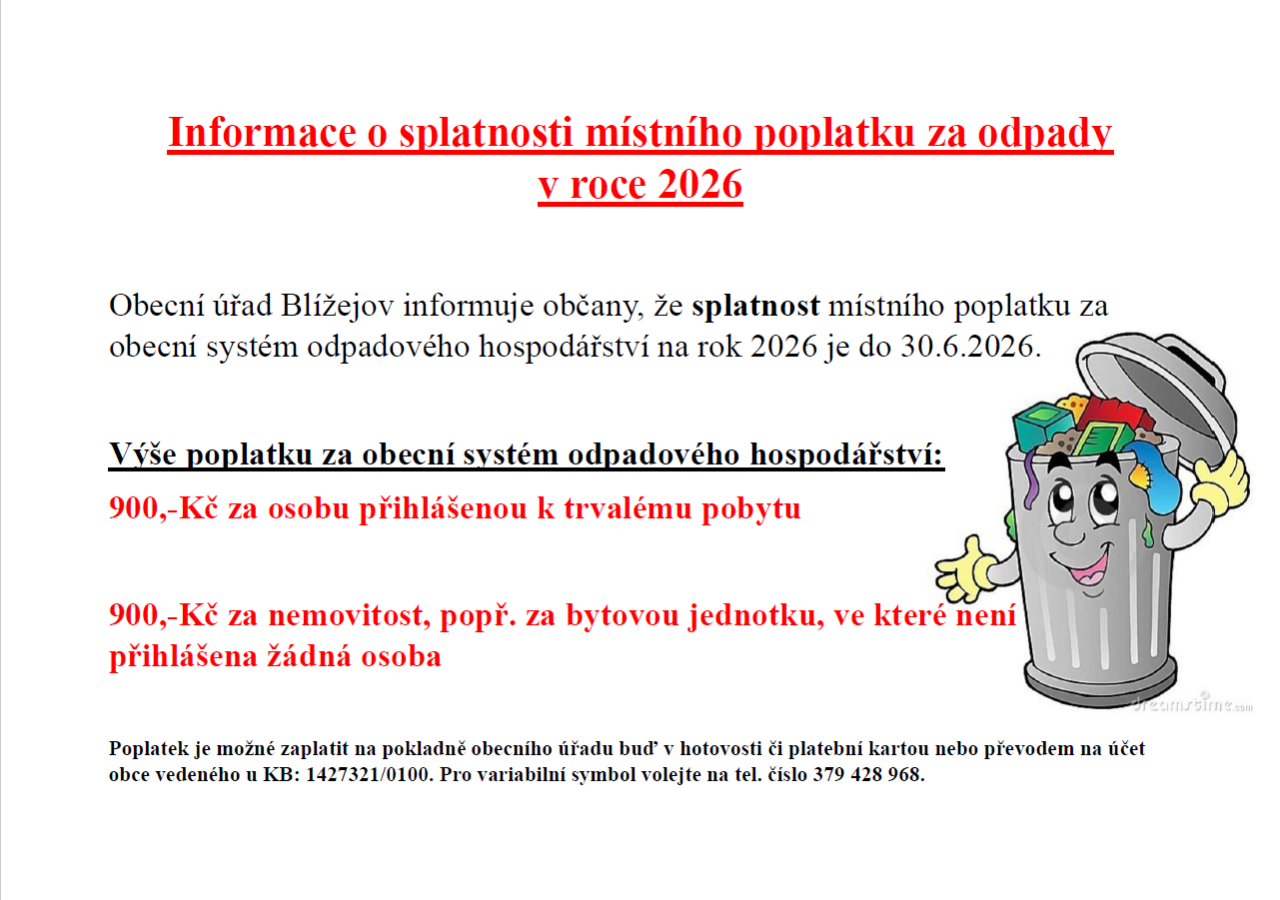 Obecní úřad informuje občany, že splatnost místního poplatku za obecní systém odpadového hospodářství na rok 2026 je do 30. 06. 2026.