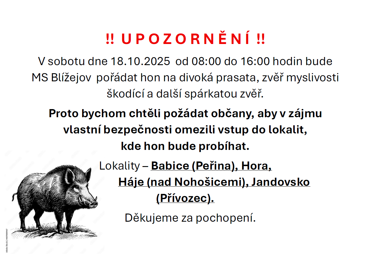 V sobotu dne 18.10.2025 od 08:00 do 16:00 hodin bude MS Blížejov pořádat hon. Proto bychom chtěli požádat občany, aby v zájmu vlastní bezpečnosti omezili vstup do lokalit, kde hon bude probíhat.