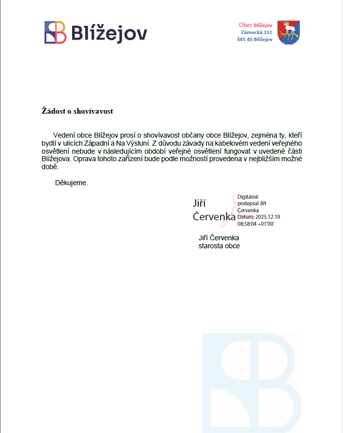 Vedení obce Blížejov prosí o shovívavost občany obce Blížejov, zejména ty, kteří bydlí v ulicích Západní a Na Výsluní. Z důvodu závady na kabelovém vedení veřejného osvětlení nebude v následujícím období veřejné osvětlení fungovat v uvedené části Blížejova. Děkujeme za pochopení.