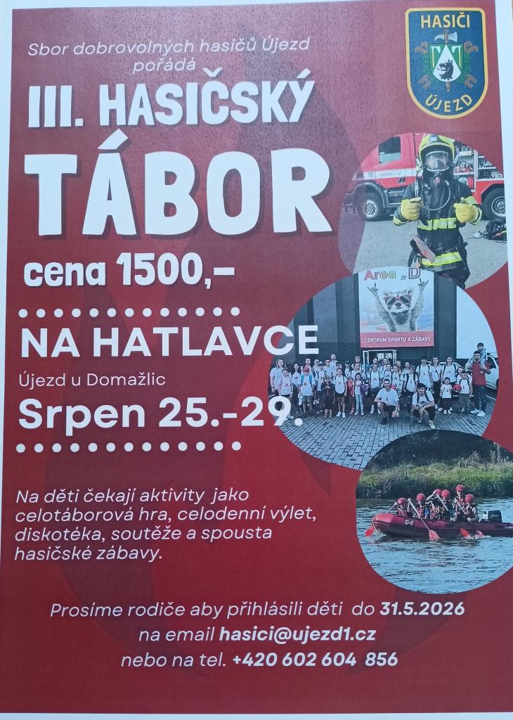 Sbor dobrovolných hasičů Újezd pořádá III. Hasičský tábor pro děti. Tábor se koná v termínu 25. - 29. srpna 2026 na Hatlavce. Prosíme rodiče, aby přihlásili své děti do 31. 5. 2026 na email hasici@ujezd1.cz nebo na tel. 602604856.