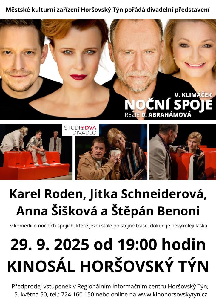 Zveme vás na divadelní představení NOČNÍ SPOJE s Karlem Rodenem, Jitkou Schneiderovou, Annou Šiškovou a Štěpánem Benonim. Těšte se na komedii o nočních spojích, které jezdí stále po stejné trase, dokud je nevykolejí láska. Akce se koná 29. 9. od 19 hodin v kinosále Horšovský Týn. Studio Dva Divadlo.