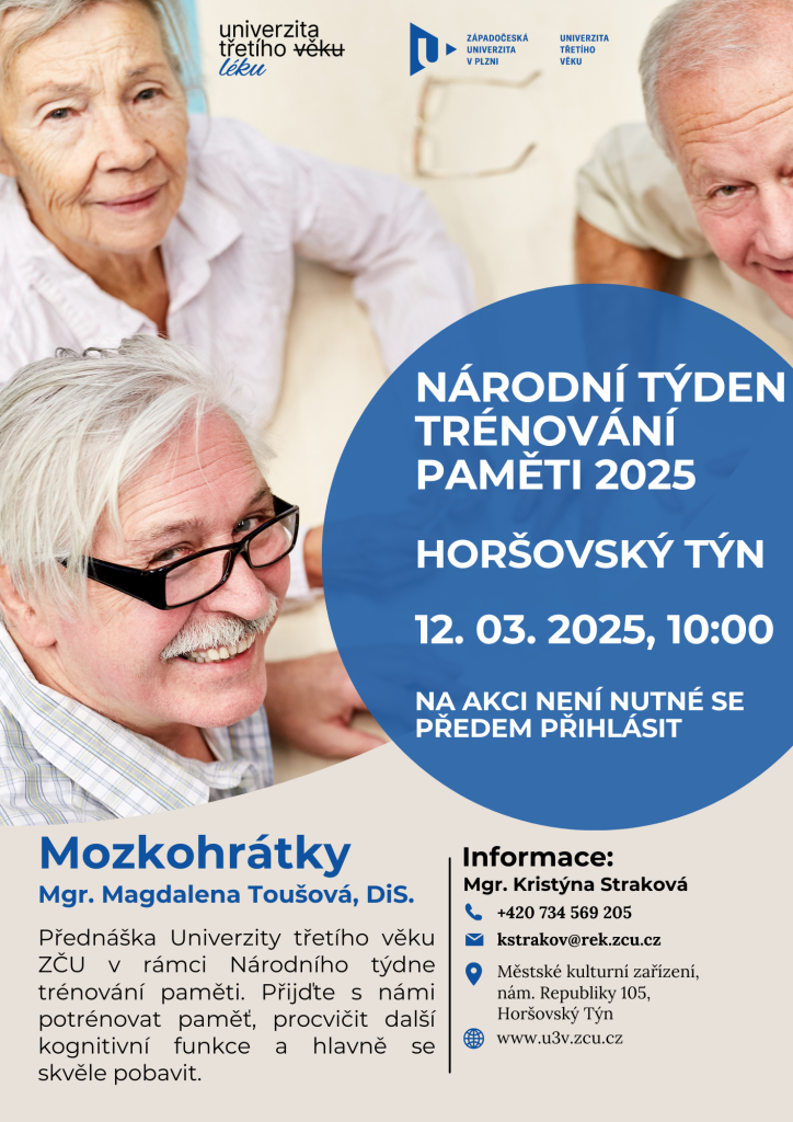 V rámci Národního týdne trénování paměti Vás srdečně zveme na přednášku Univerzity třetího věku ZČU "Mozkohrátky". Přijďte s námi 12. března 2025 potrénovat paměť, procvičit další kognitivní funkce a hlavně se skvěle pobavit. Přednáška začíná v 10:00 hodin v sále Městského kulturního zařízení.