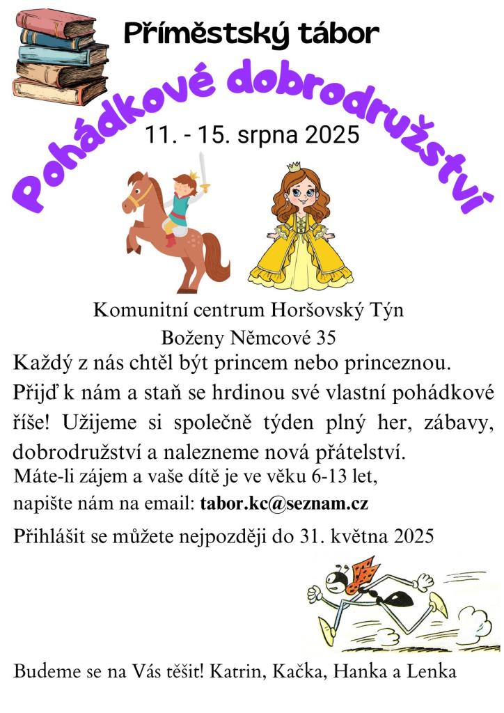 Přijďte na pohádkový tábor v Komunitním centru Horšovský Týn od 11. do 15. srpna 2025! Děti ve věku 6-13 let zažijí týden plný her, dobrodružství a nových přátelství. Přihlásit se můžete do 31. května 2025.