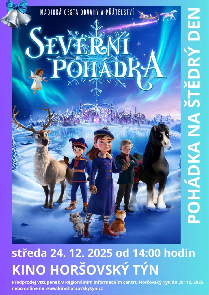 Přijďte si zkrátit čekání na Ježíška ve středu 24.prosince 2025 do horšovskotýnského kina. Od 14:00 hodin promítáme okouzlující animovaný film Severní pohádka. Příběh malé Gerdy, která se vydává na dobrodružnou cestu, aby našla svého přítele Kaie. Film o magické cestě odvahy a přátelství .