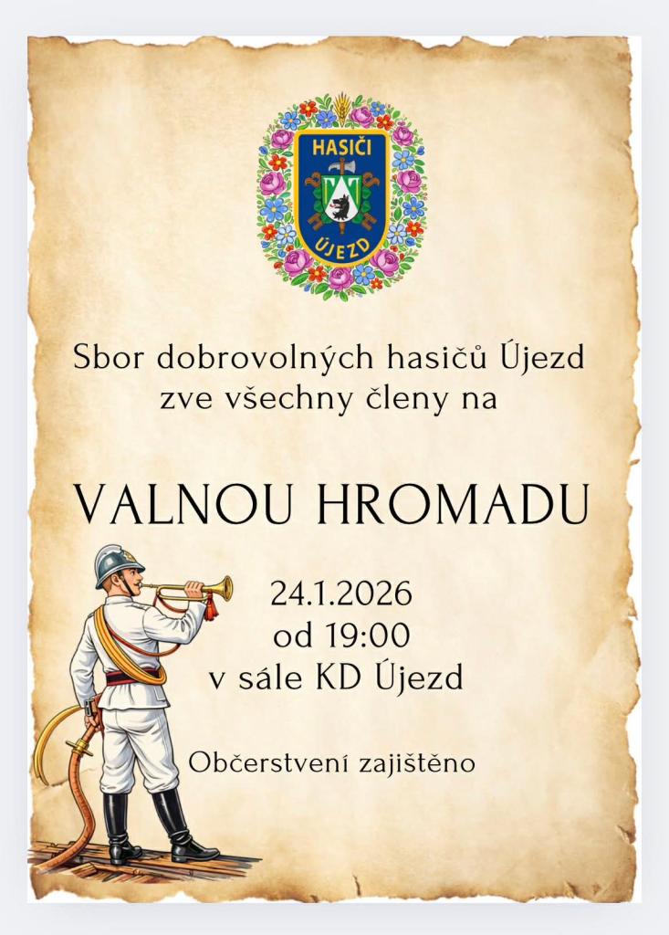 Sbor dobrovolných hasičů Újezd tímto zve všechny členy na valnou hromadu, která se koná 24. ledna 2026 od 19:00 hodin v sále Kulturního domu v Újezdě.