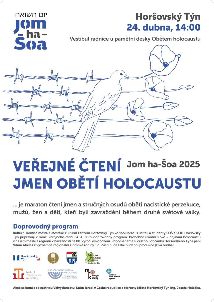 Zveme vás na veřejné čtení jmen obětí holocaustu Jom ha-Šoa 2025, které se uskuteční 24. dubna 2025 v 14:00 u pamětní desky Obětem holocaustu ve vestibulu radnice.